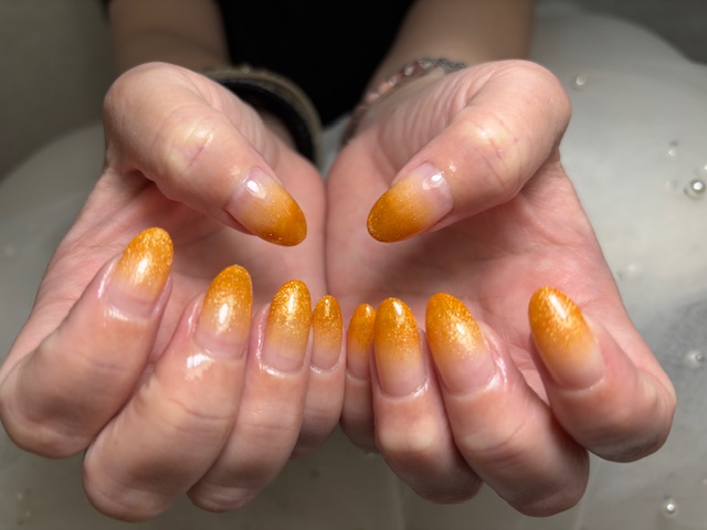 マグネットネイルにはまって今回はグラデーションにしてみました(*^▽^*)ゴールドにするつもりが発色のキレイさでオレンジよりのを選びました?